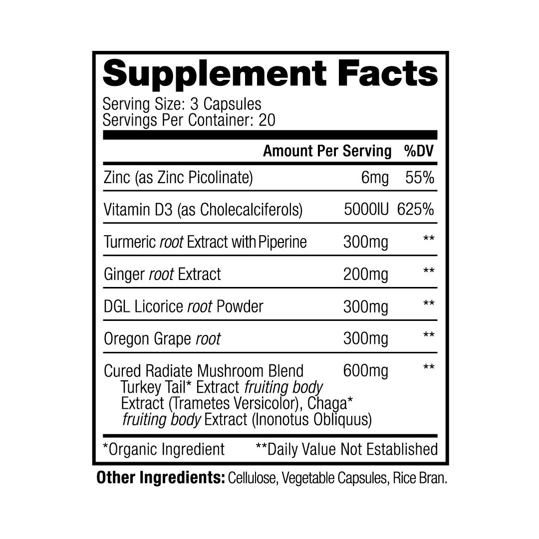 Zinc (as Zinc Picolinate), Vitamin D3 (as Cholecalciferols), Turmeric Root Extract with Piperine, Ginger Root Extract, DGL Licorice Root Powder, Oregon Grape Root, Cured Radiate Mushroom Blend (Turkey Tail* Fruiting Body Extract (Trametes Versicolor), Chaga* Fruiting Body Extract (Inonotus Obliquus). *Organic