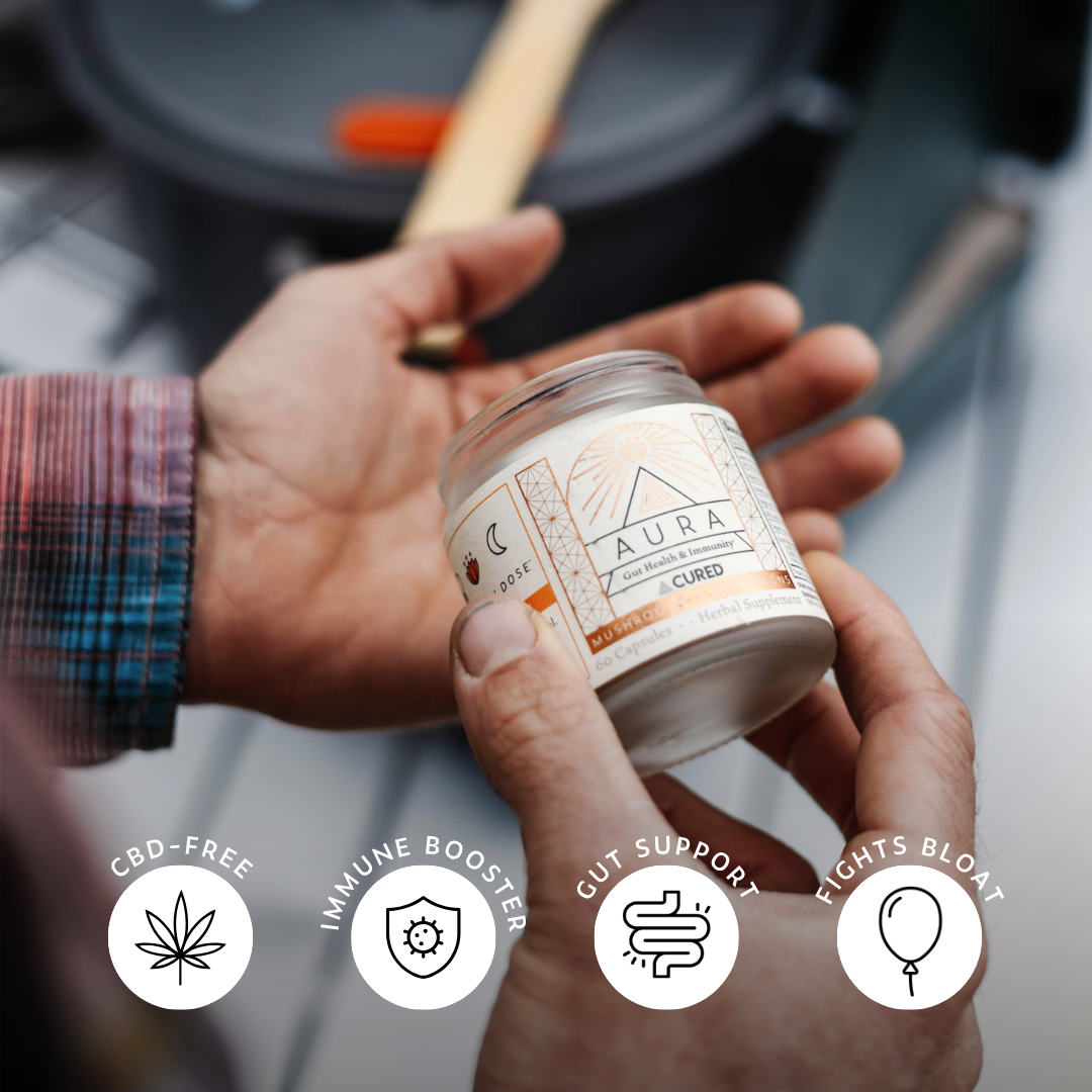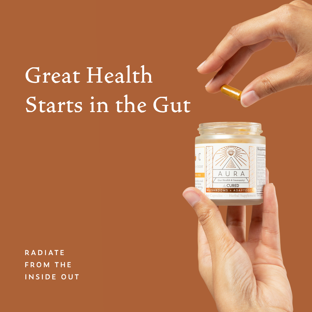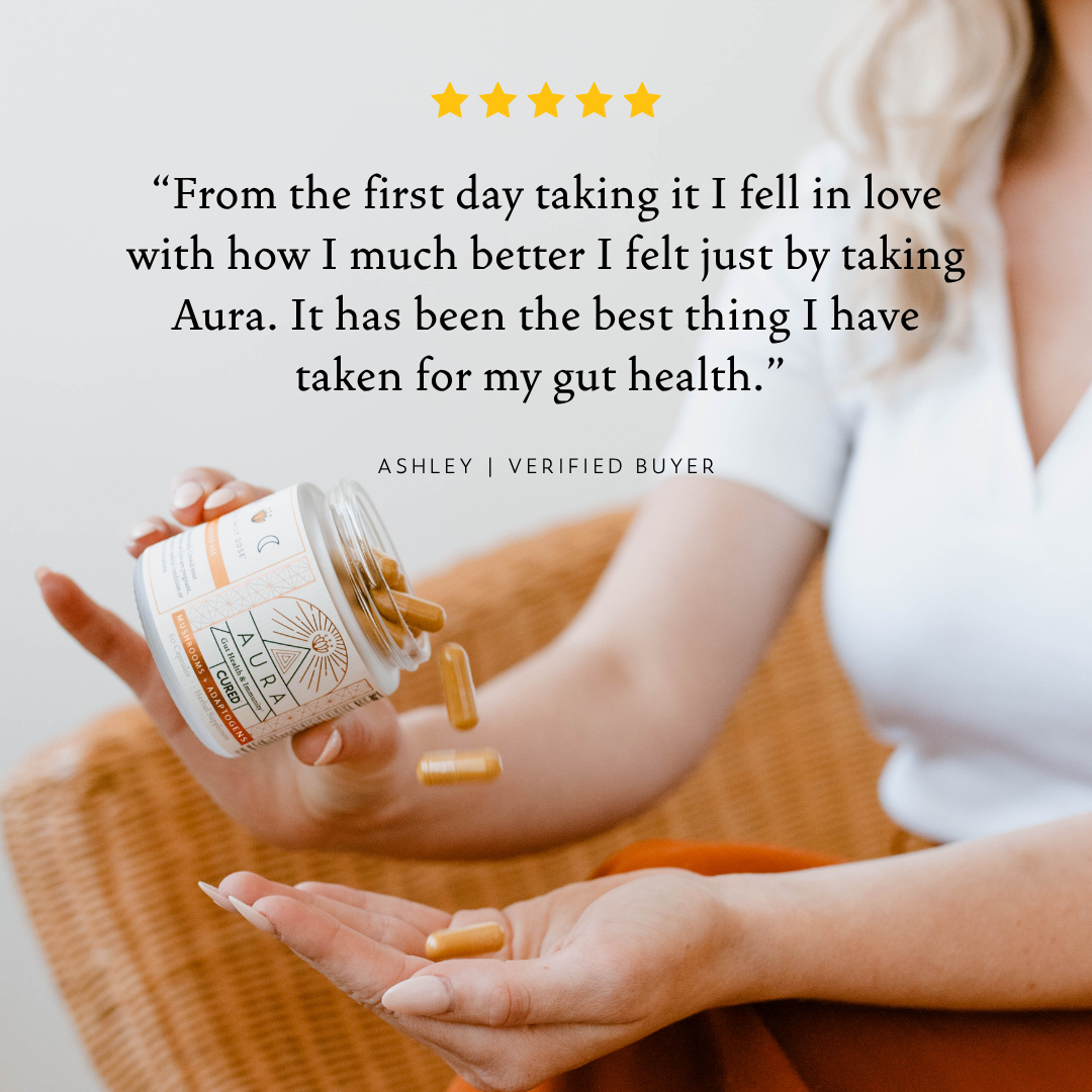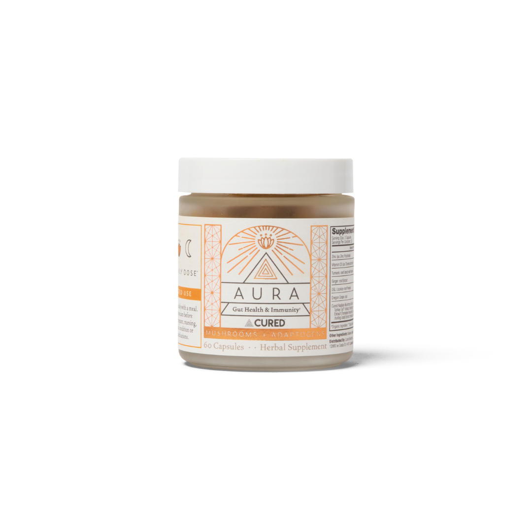 Pop 3 capsules with your preferred meal or snack and kiss the bloat goodbye. Keep in mind, you are improving your body’s innate defense system when you incorporate gut-supporting practices, like: consuming prebiotic-rich foods (think: mushrooms and fiber!), staying hydrated, and adding immune-boosting supplements like Aura to your routine.