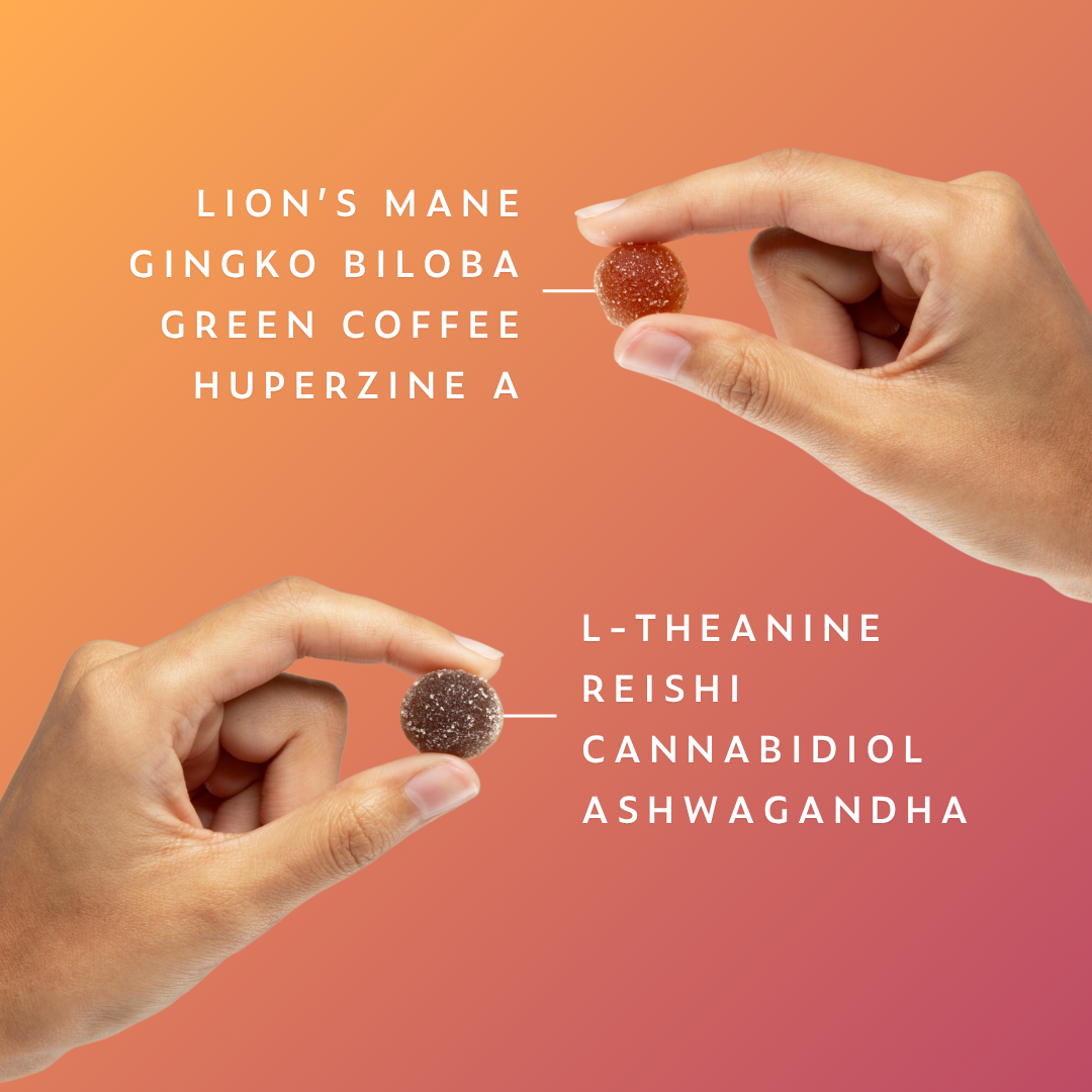 Organic Lion’s Mane Fruiting Body Extract, Organic Ginkgo Biloba Extract, Organic Green Coffee Bean Extract, Huperzia Serrata, Vitamin B12 (as Methlycobalmin), Organic Cane Sugar, Organic Tapioca Syrup, Purified Water, Pectin, Citric Acid, Sodium Citrate, Organic Apple Flavor, Organic Sunflower Lecithin.