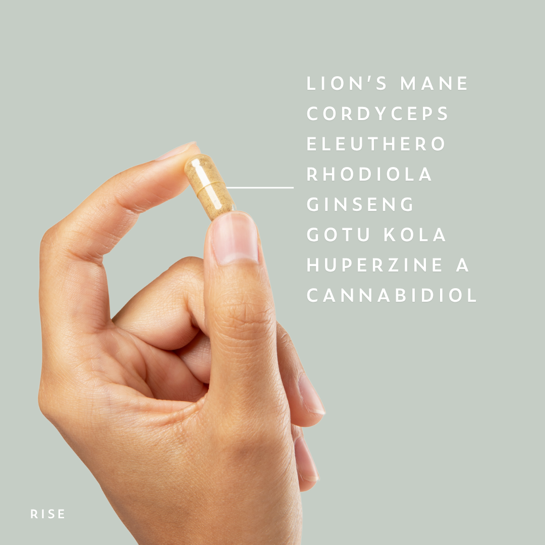 With functional ingredients like Lions Mane Mushroom, Cordyceps Mushroom, Ginseng and Rhodiola, Rise is formulated to build your brain, boost your stamina, and improve your clear-headed focus.
